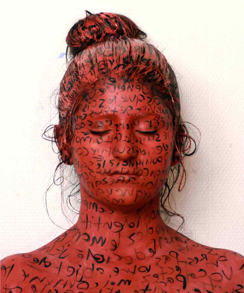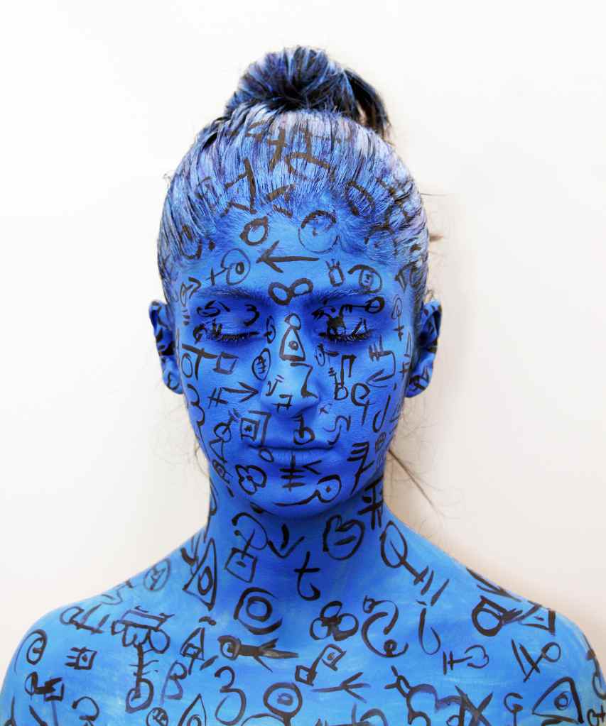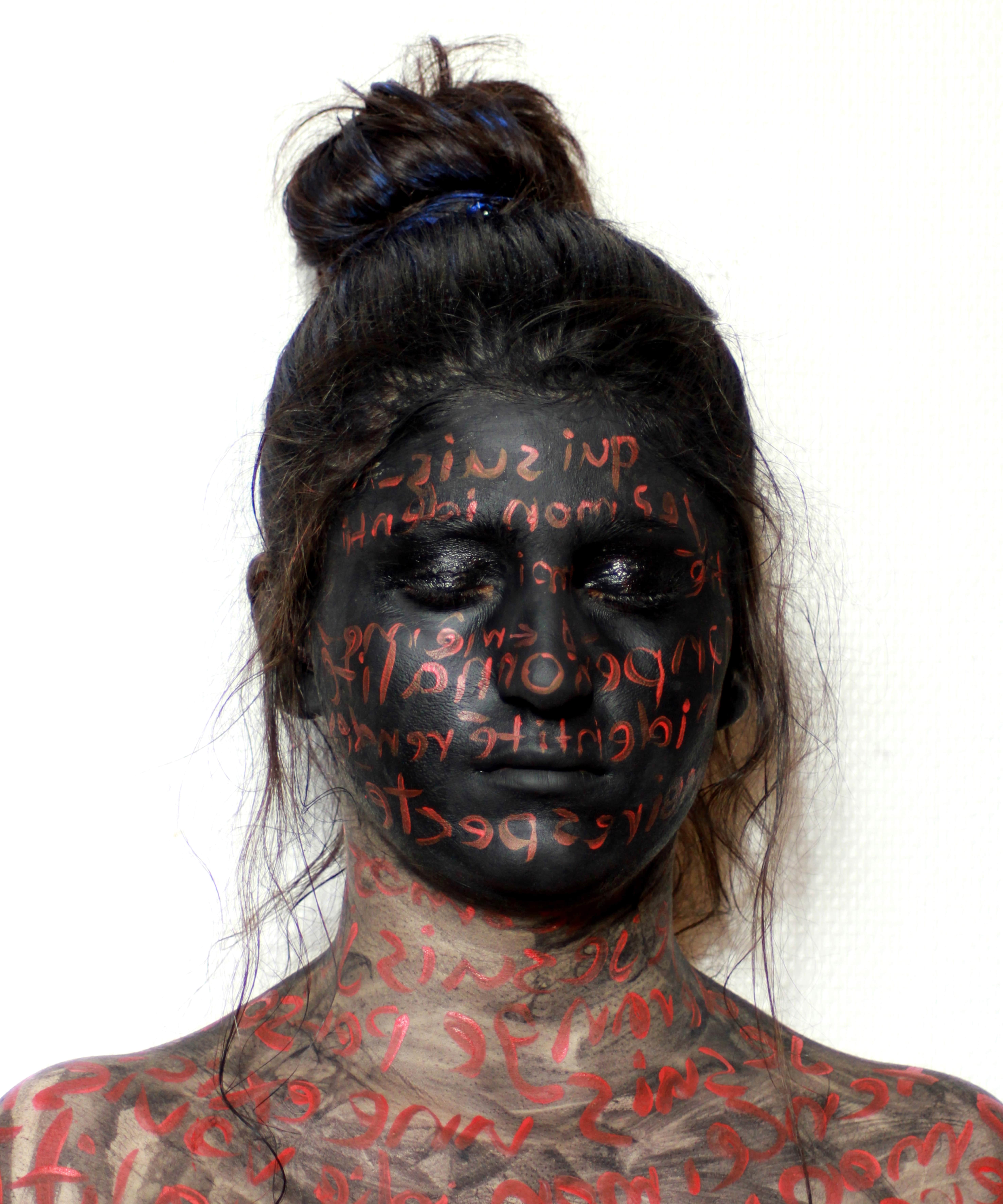 Avec ce regard et en pensant à ma vraie image identitaire, mon visage peut créer des images précises qui représentent une culture multiple, ou un symbole la souffrance d’un individu qui ne sait pas d’où il vient. Ce processus de regard sensibilise et touche mon individualité, et il m’amène à écrire sur mon visage. La calligraphie que j’utilise est constituée à la fois de signes et de formes plus ou moins géométriques. Je l’utilisais au début afin de coucher sur le papier, d’extérioriser mes sentiments sans que les autres ne puissent le comprendre. Chaque couleur apporte plus de sens, ou en tout cas donne un sens différent à l’image, qu’elle soit le fruit d’une interprétation subjective ou objective.